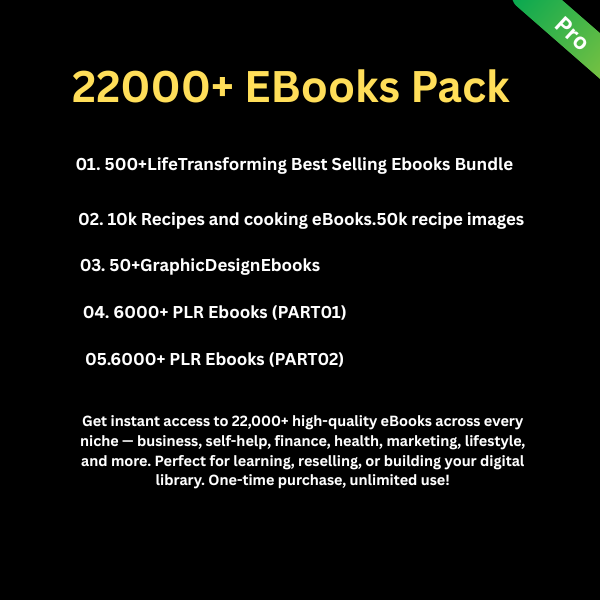 Start building your digital business today with the 22000+ Ebooks Pack — your gateway to unlimited content, unlimited resale, and unlimited earning potential.